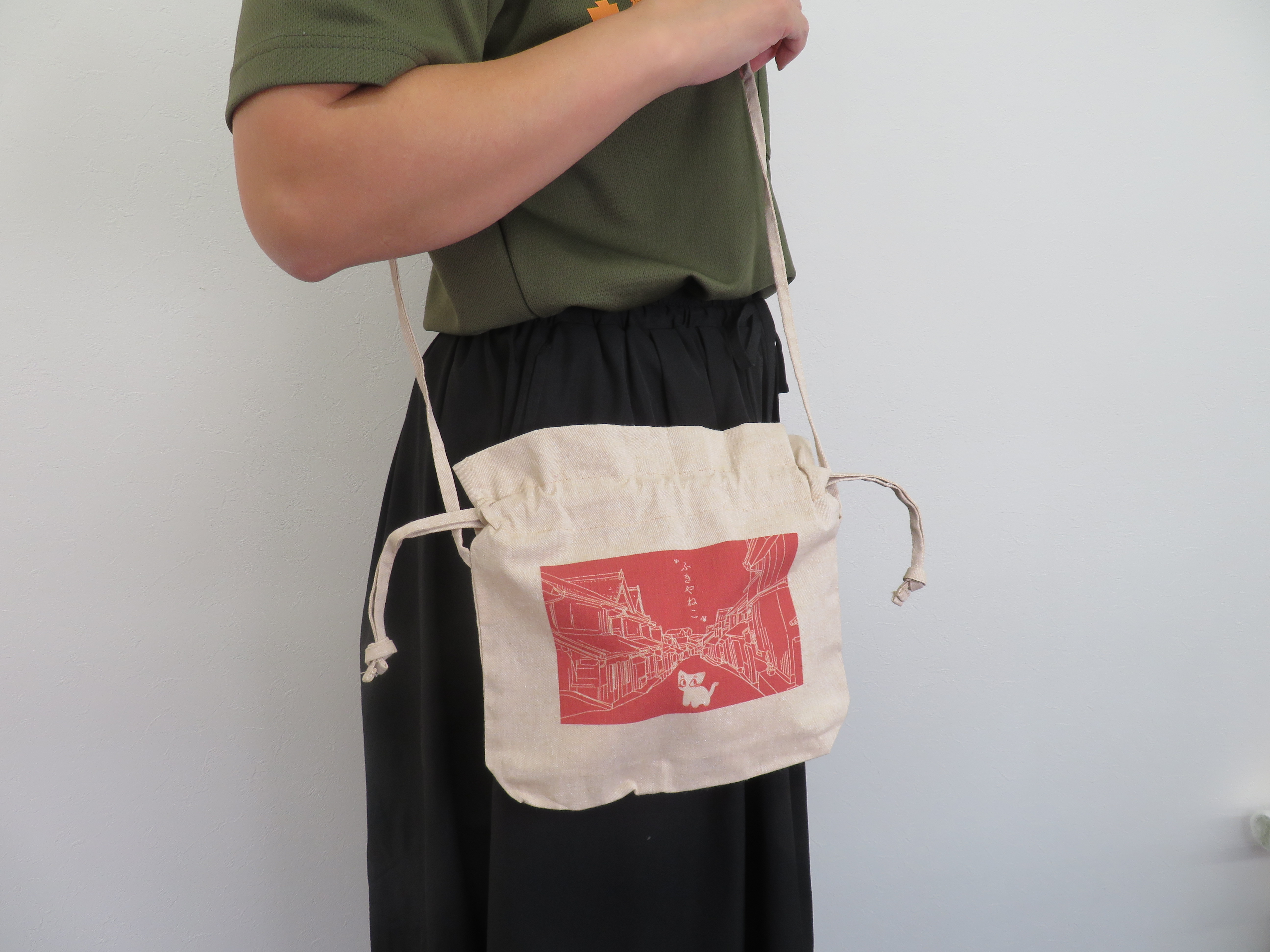 「吹屋」×「吹き矢」を掛け合わせた駄洒落と、吹屋に住み着く猫をモデルにしたポップでかわいいキャラクター「ふきやねこ」を使用したショルダーバッグ巾着。