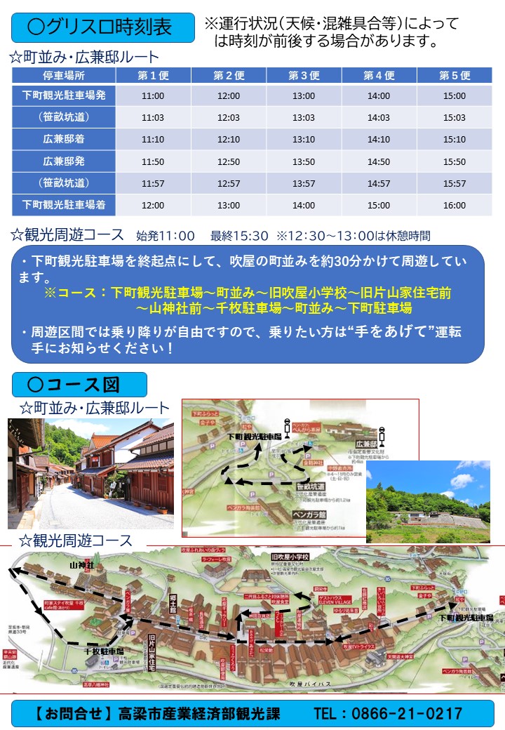 令和8年度は、吹屋の町並みを周遊する「観光周遊コース」と下町駐車場からベンガラ館・笹畝坑道を経由して広兼邸まで運行する「吹屋散策コース」となっており、ゆっくりと吹屋の日本遺産構成文化財を観光できます。